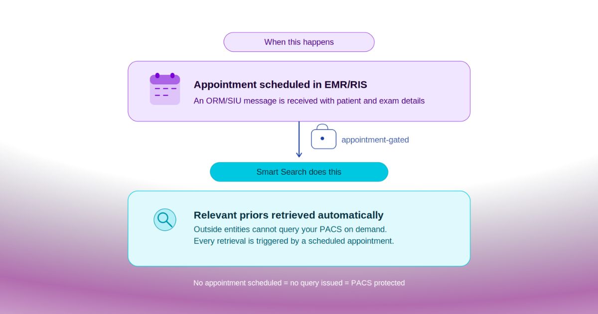Smart Search eliminates the manual work of prior study retrieval, automatically triggered, verified, and delivered before every appointment.